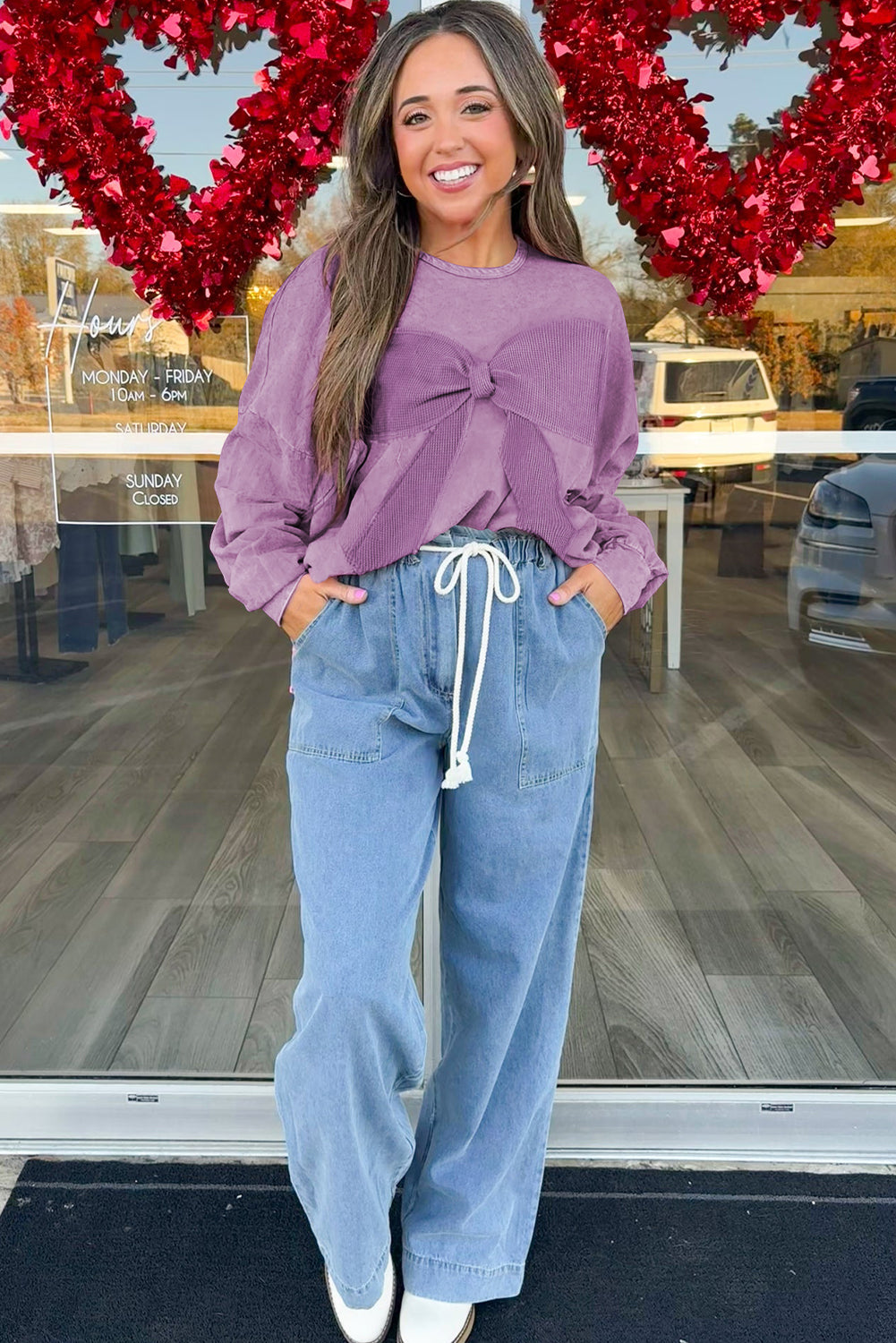 Bright Pink Mineral Wash Waffle Bow Patched Pullover Sweatshirt
